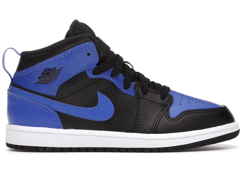 The Jordan 1 Mid Hyper Royal (PS) comes in pre-school sizes with a black, Hyper Royal, and white color scheme. The upper is crafted from durable leather with perforations for breathability. A cushioned midsole and rubber outsole provide support and traction. Padded tongue and collar enhance comfort, while Nike Swoosh, Wings logo, and Jumpman branding complete the design.
