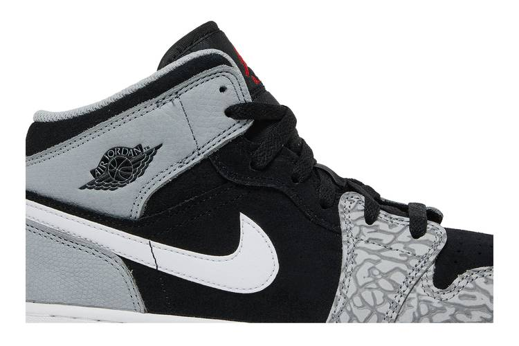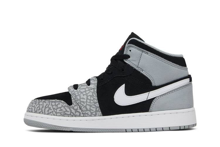 The Air Jordan 1 Mid SE Elephant Print (GS) is a stylish sneaker from Nike with a leather upper and plastic rubber sole. Designed for grade-schoolers, this sneaker features a black suede base with a white leather Nike Swoosh and light smoke grey accents on the outsole, heel flaps, heel cup, and toebox. Inspired by the iconic Air Jordan 1, this sneaker was released on August 25th, 2022.