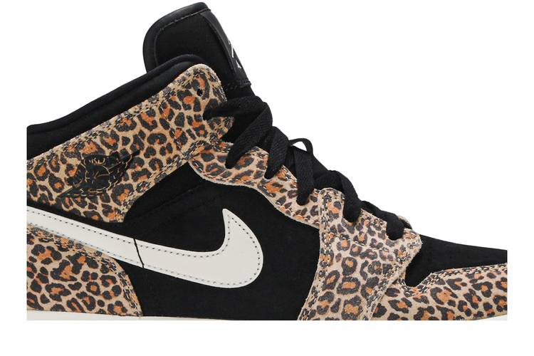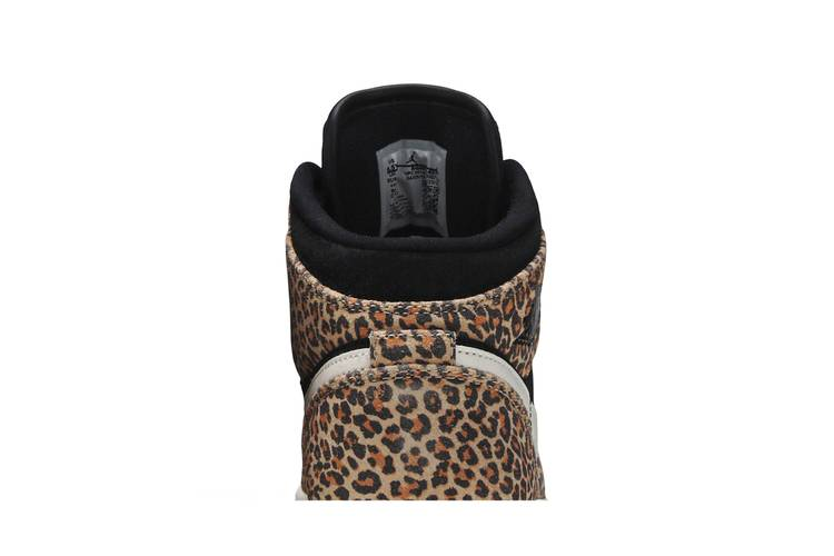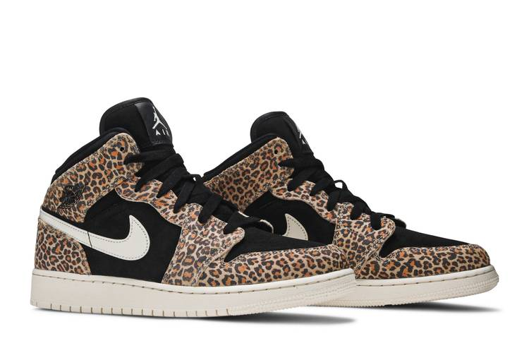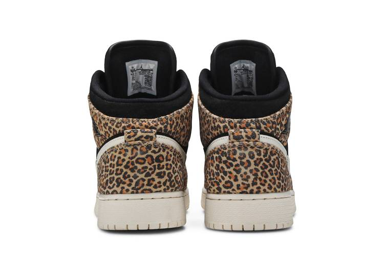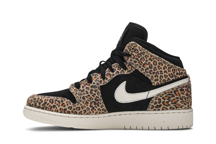 The kids Jordan 1 Mid SE Leopard (GS) features a black base with a classic leopard print design wrapping around the shoe. The cream-colored heel and Nike Swoosh logo offer a contrast to the black base, while the black Air Jordan logo on the side pays homage to the shoe's heritage. Released in November 2019, this sneaker is a stylish addition to any young sneakerhead's collection.