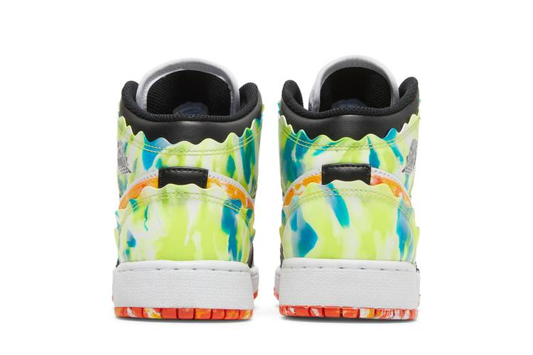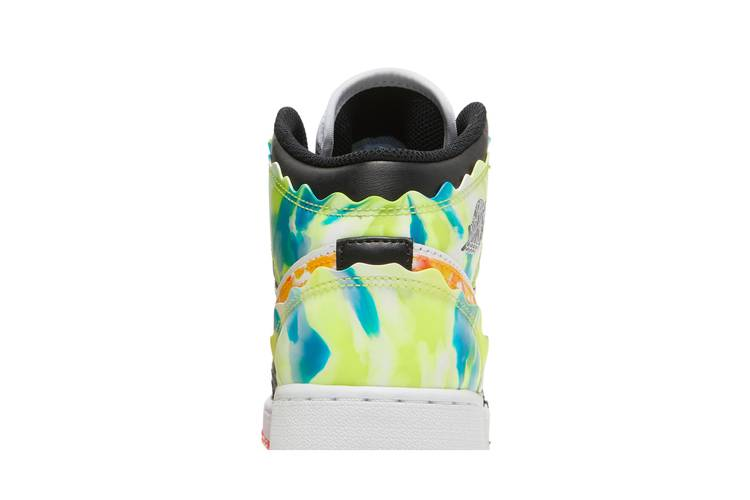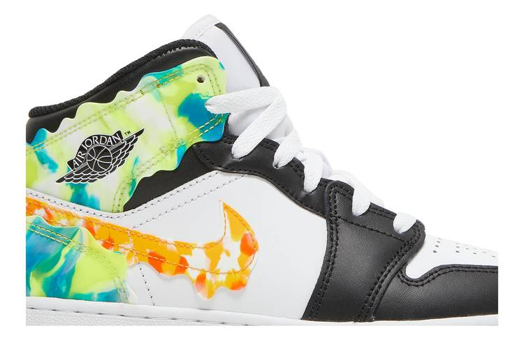 The Jordan 1 Mid SE Slim Vortex (GS) is a grade-school sneaker inspired by 80s design and the Nike Air Vortex concept. Made with soft leather, the predominantly black and white colorway features a unique Vortex design on the heel and Nike Swoosh. The mid-top design offers ankle support, while the foam midsole provides cushioning. Perforations on the toe box improve ventilation, and the padded collar and tongue enhance comfort. Released on March 21st, 2022.