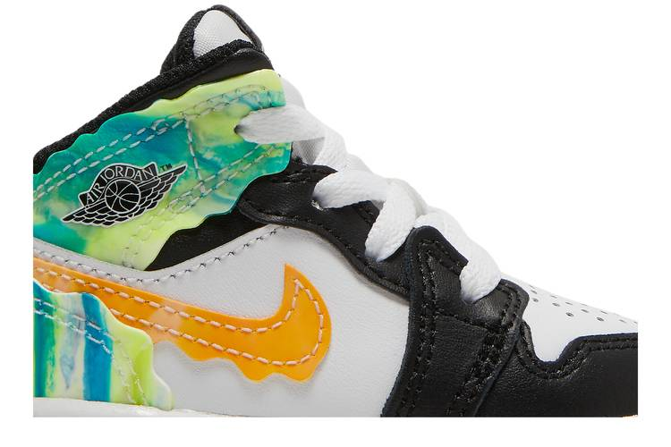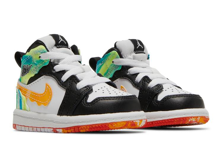 The Air Jordan 1 Mid SE TD ‘Drip’ for toddlers showcases a playful and eye-catching design inspired by melting elements. Constructed with a leather upper in white and black, the shoe features wavy edges and swirling colors on the heel panel, collar flap, and Swoosh. The rubber outsole completes the look with a marbled mix of red, orange, and white hues. Designed for little feet, this shoe offers a unique and stylish option for young sneaker enthusiasts.