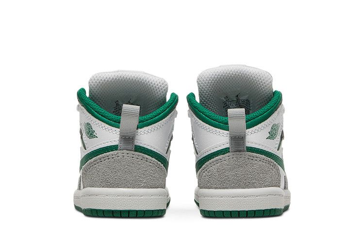 The Jordan 1 Mid SE White Pine Green (TD) features a white leather upper with perforations for breathability, accented by gray hairy suede overlays. A green leather collar displays the Wings logo, matching the Swoosh and outsole. The padded mesh tongue ensures comfort for toddlers, while the foam insole with Air cushioning provides support.