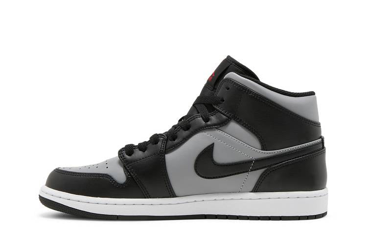 The Air Jordan 1 Mid GS ‘Shadow’ is a stylish sneaker inspired by an iconic OG colorway. It features a grey smooth leather upper with black leather overlays, a color-matched Swoosh, and red accents on the Jumpman icon and Wings logo. The shoe is built on a durable rubber cupsole with white sidewalls, a black outsole, and heel Air-sole cushioning. It combines a classic design with modern comfort, making it a versatile choice for everyday wear.
