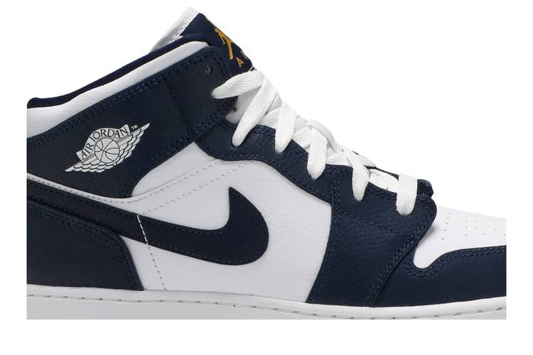 The Air Jordan 1 Mid White Metallic Gold Obsidian GS features a leather upper in obsidian and white hues, with Swooshes on the sides and signature Wings branding on the...