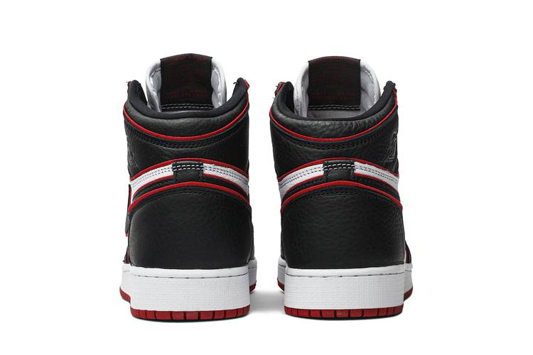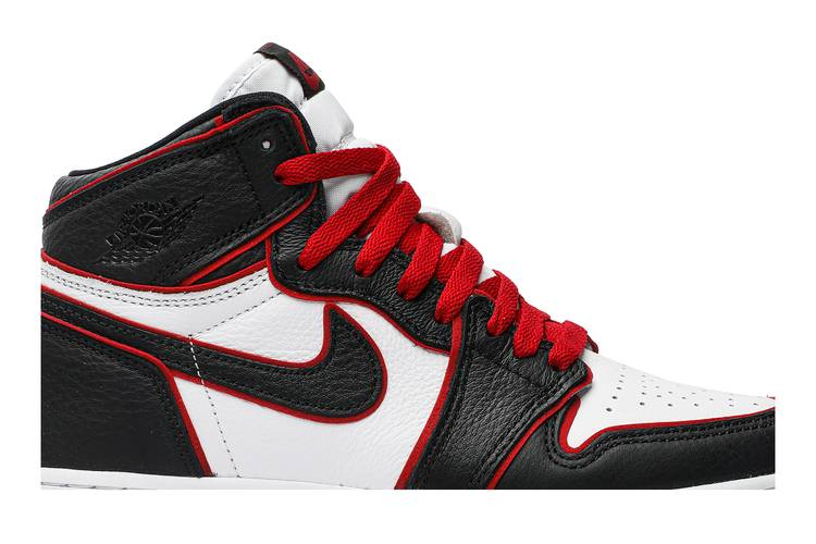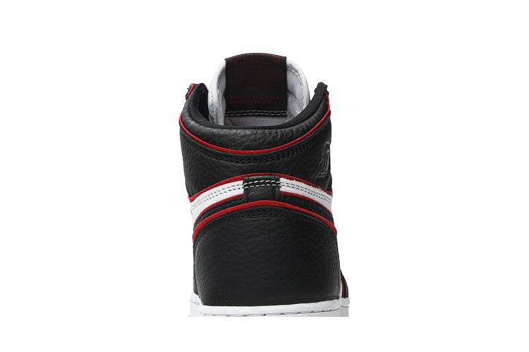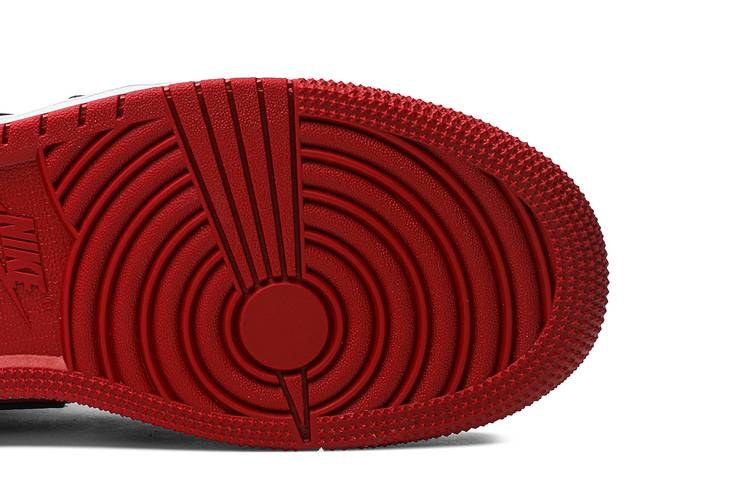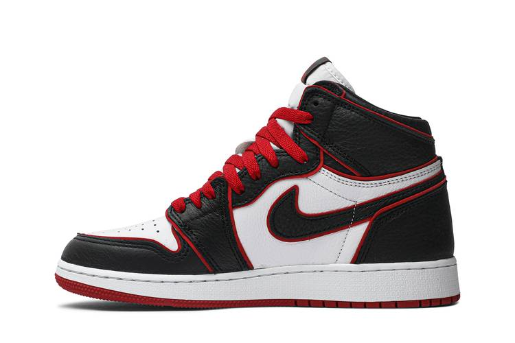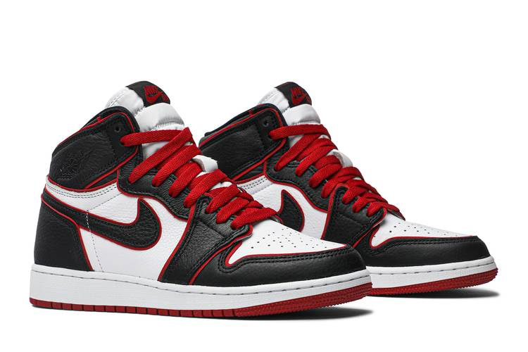 The Jordan 1 Retro High Bloodline (GS) for kids is crafted with a tumbled leather upper in black, Gym Red, and white colors. Featuring a classic design with black overlays...