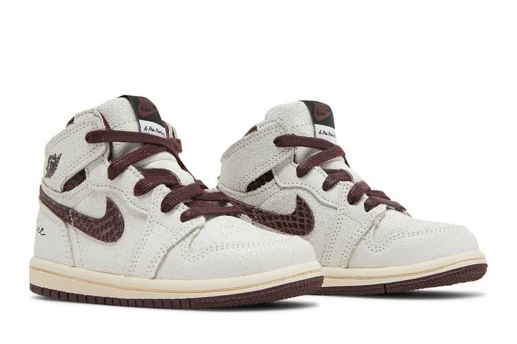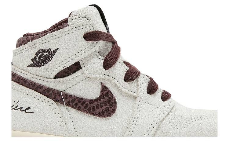 The Jordan 1 Retro High OG A Ma Maniere TD is a collaboration between Jordan Brand and A Ma Maniere boutique, featuring a Sail/Burgundy Crush colorway. The shoe boasts a cracked-white leather upper, quilted interior lining, and burgundy snakeskin Swooshes. The Wings logo is on the collar, while the tongue showcases "A Ma Maniere" and "Nike Air" detailing. The design includes an artful expression on the side of the shoe. A burgundy outsole and cream rubber midsole complete the look.