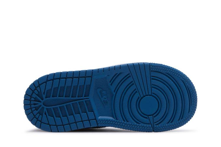The Air Jordan 1 Retro High OG Dark Marina Blue TD is a toddler-sized sneaker featuring a black leather upper with blue overlays. It includes classic branding details like a...
