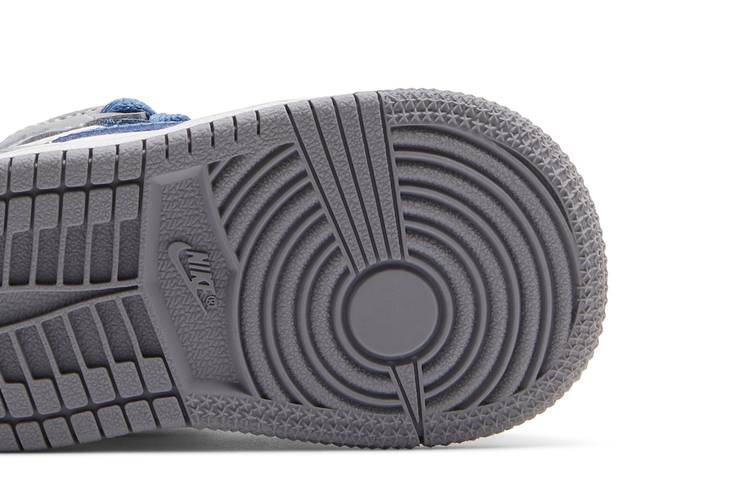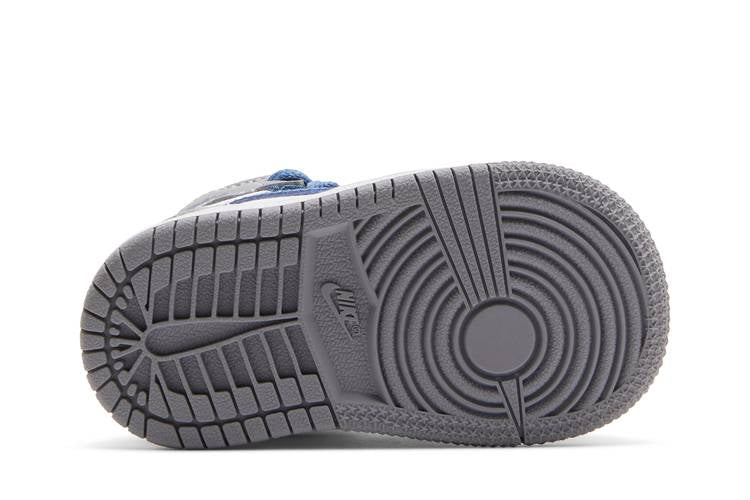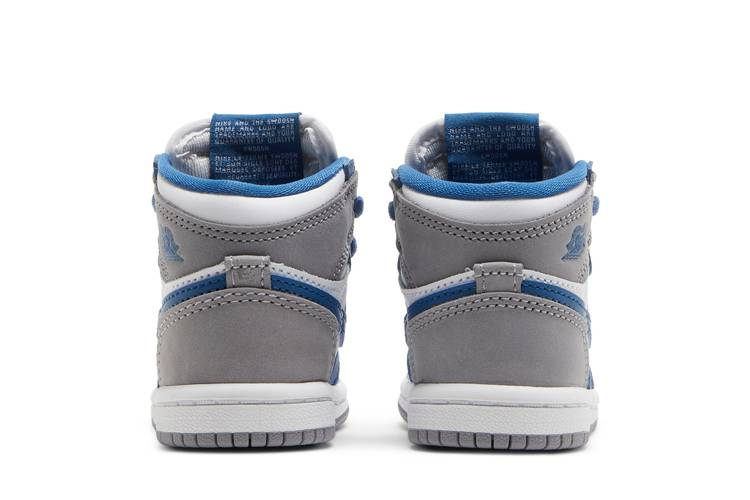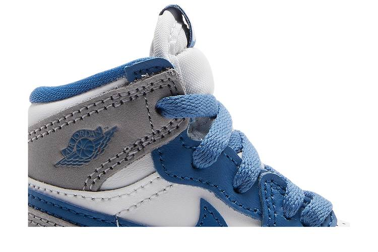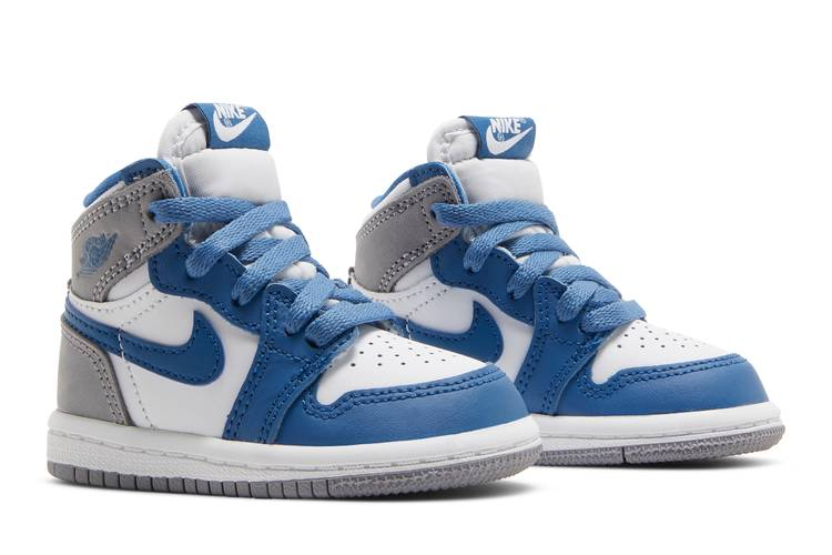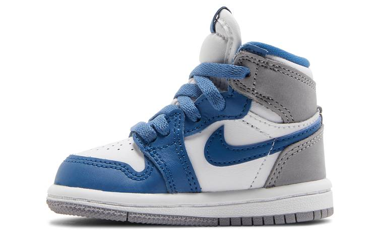 The Jordan 1 Retro High OG True Blue (TD) features a white leather upper with True Blue accents on the forefoot overlay, Swoosh logo, and eyestay. Cement grey detailing is found on the heel and collar overlay, with a blue Wings logo. The shoe includes a woven Nike Air tongue tag and lightweight cushioning with an enclosed Air-sole unit in the heel. The design stays true to the original Air Jordan 1 silhouette with a perforated toebox and linear traction pattern, making it a classic choice for toddlers.