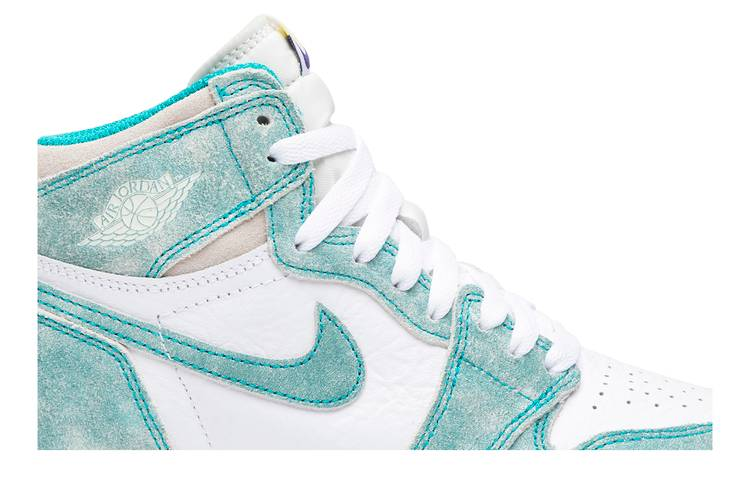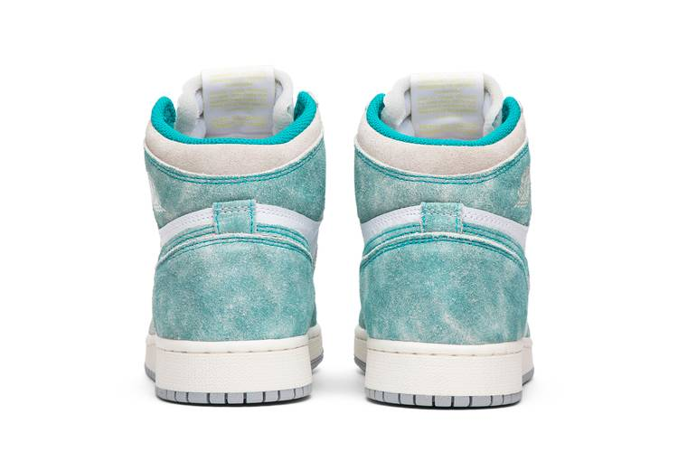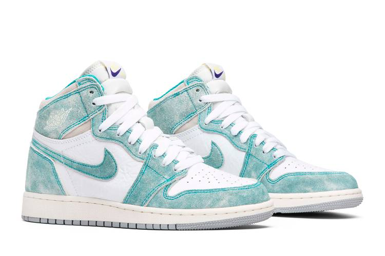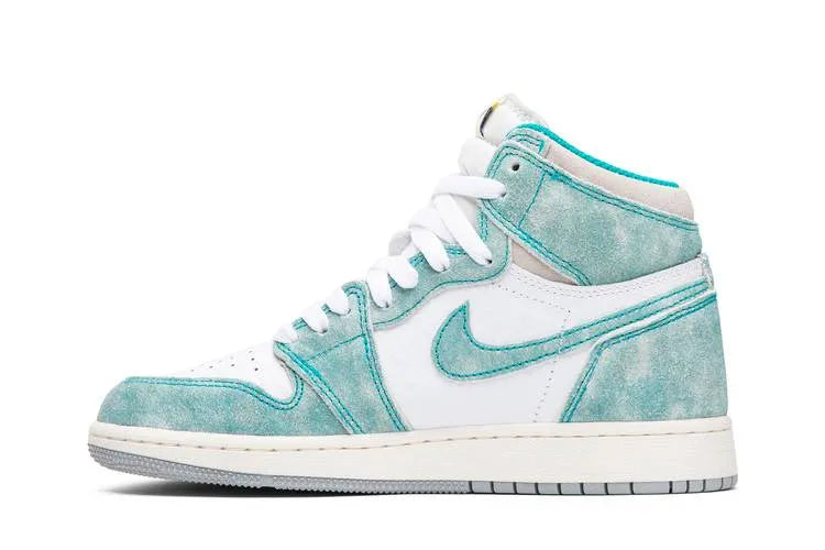 The Air Jordan 1 Retro High Turbo Green (GS) is a kids' version of the classic retro sneaker released in 2019. The white and teal leather upper pays homage to the Charlotte Hornets, with distressed overlays for a vintage aesthetic. Features include a traditional Swoosh on the mid panel, Wings logo on the ankle, Sail foam midsole with Air cushioning, and a grey rubber outsole for contrast.
