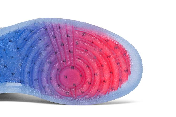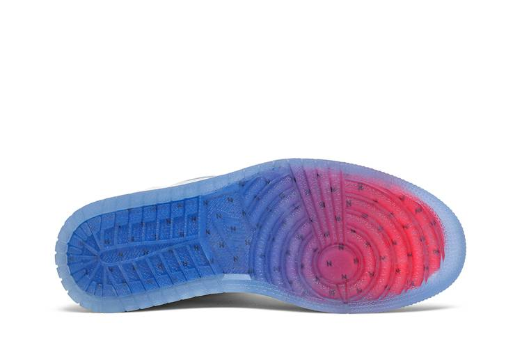 The Air Jordan 1 Retro High Zoom White Racer Blue features full-length Zoom Air cushioning, clear overlays on the heel panel and collar flaps, and a white leather upper with patent leather overlays. The design is completed with a translucent rubber outsole featuring gradient blue-red coloring. Released in March 2020, these sneakers offer a modern twist on a classic silhouette.