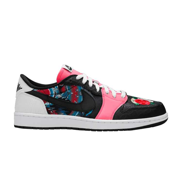 The Jordan 1 Retro Low Chinese New Year (2020) is a limited-edition release celebrating Chinese New Year. It features a mismatched design with suede, leather, and patent leather construction. Chinese graphics appear on the toebox and mid panels, while red roses are embroidered on the right toe and left Swoosh. Additional details include a nylon tongue with pink accents, mismatched laces, 'Wings' logo on the heels, and 3M reflective heel panels. The sole combines a white midsole with black and pink rubber outsoles.