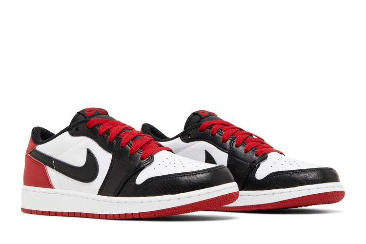 The Air Jordan 1 Retro Low OG Black Toe (2023) (GS) is a stylish and iconic sneaker designed for grade-schoolers. Featuring a classic color scheme of white, black, and Varsity Red, this shoe boasts an all-leather upper with black accents on the forefoot overlay, eyestay, and Swoosh. The heel and back tab showcase bold hits of Varsity Red, while the tongue tag and sockliner feature Nike Air branding. The midsole offers encapsulated Air-sole cushioning for comfort, and the durable rubber outsole provides traction. Inspired by the original 1985 colorway, this shoe is a timeless addition to any young sneakerhead's collection.