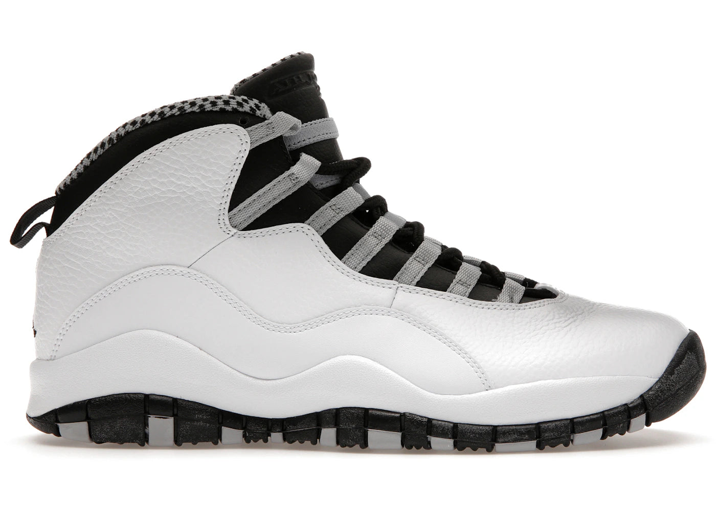 The Air Jordan 10 Retro Steel (2013) features a white, black-light steel, and grey-varsity maize colorway. The leather upper includes textured overlays and a heel Jumpman logo. A pull tab,...