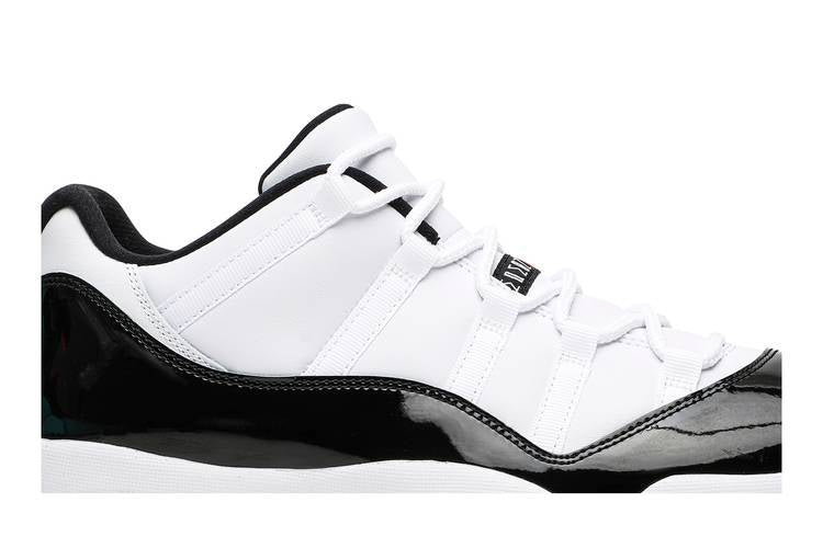 The Air Jordan 11 Retro Low 'Concord-Bred' combines two iconic OG colorways of the original mid-top silhouette. The upper replicates the look of the ‘Concord’ Air Jordan 11, featuring a white leather upper with a signature patent leather overlay in contrasting black and unexpected red branding elements at the tongue and heel. A white foam midsole gives way to a semi-translucent red rubber outsole, borrowed from the ‘Bred’ Air Jordan 11. Jordan Brand combined elements of two of their greatest Jordan 11 colorways to create the Jordan 11 Retro Low Concord Bred, now available on StockX. This hybrid design takes the upper of a traditional Jordan 11 Low Concord and pairs it with the red outsole of the Jordan 11 Bred. The Jordan 11 Low Concord Bred consists of a white upper with black patent leather overlays and black detailing. A white midsole, red translucent outsole, and Jordan branding on the tongue complete the design.