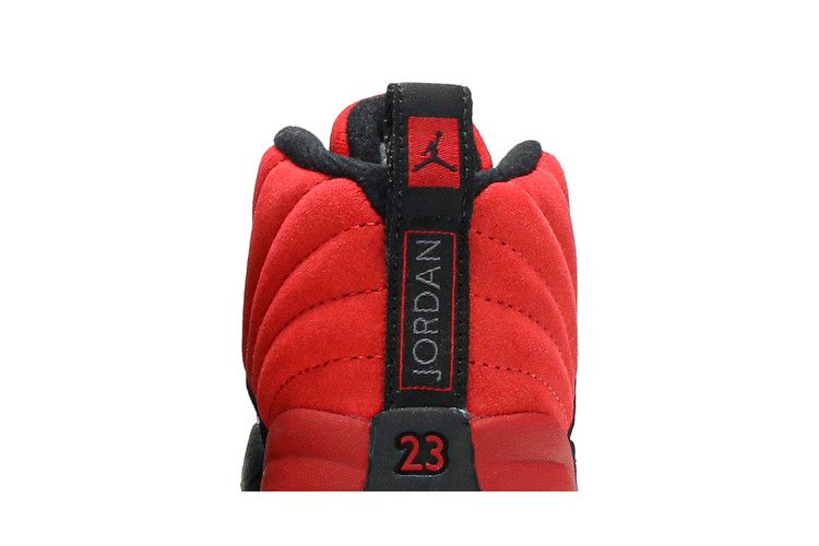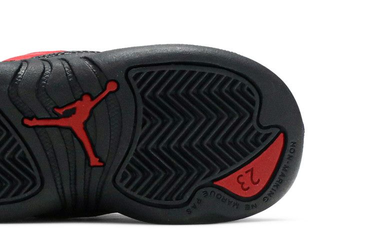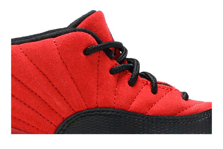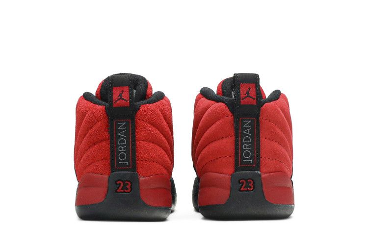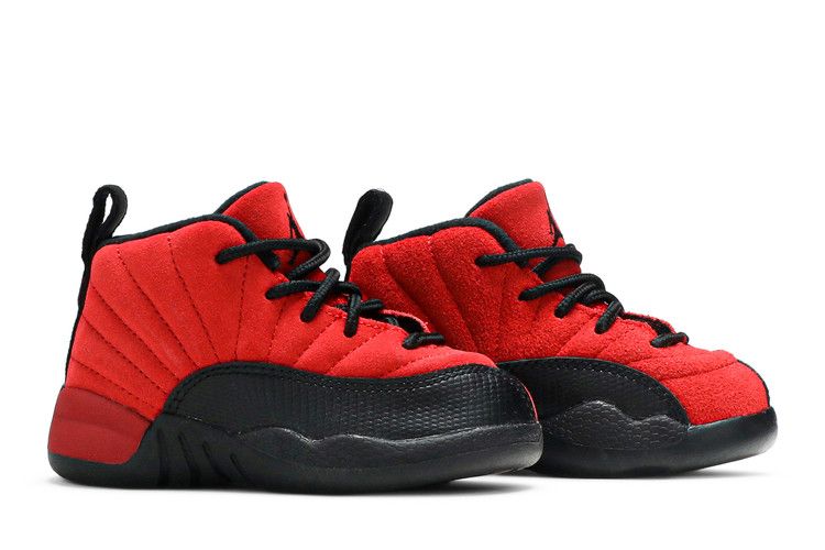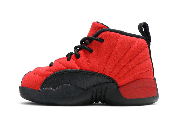 The Air Jordan 12 Retro Reverse Flu Game (TD) features a reversed red and black colorway from the original design. The toddler sneaker has a suede upper with black foam...