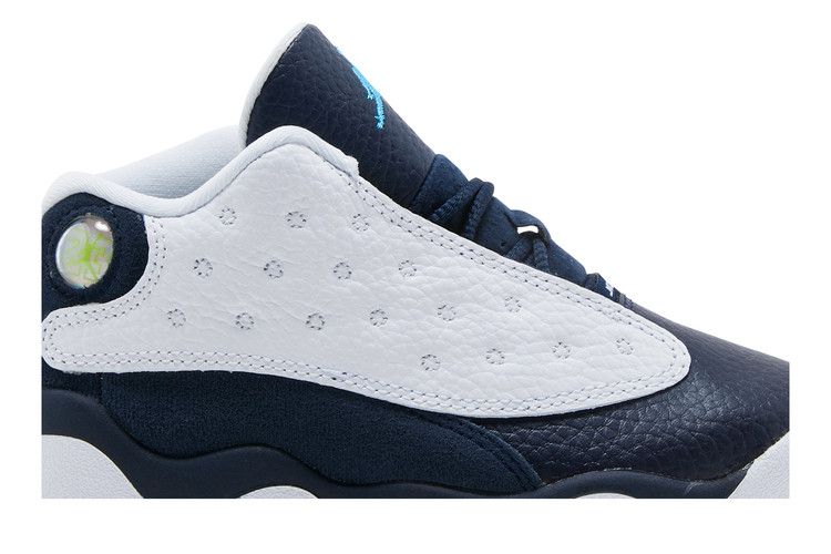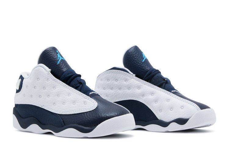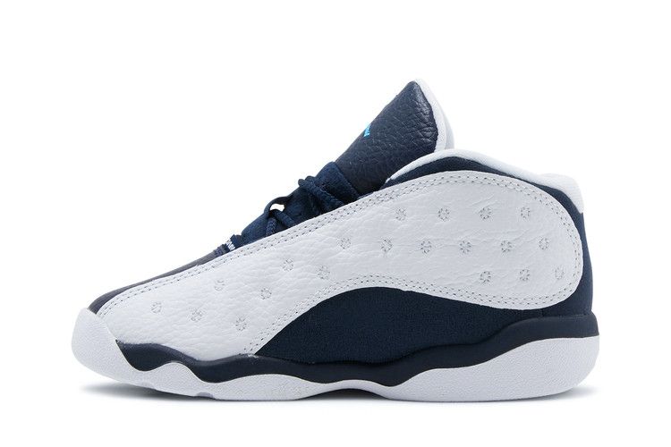 The Jordan 13 Retro White Obsidian Powder Blue (TD) features a white rubber outsole with a wavy edge and black midsole. The upper combines black textured leather with powder blue...
