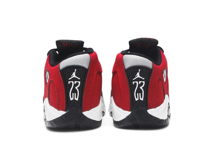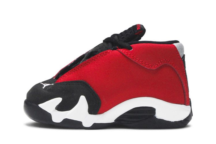 The Air Jordan 14 Retro Toro TD features a vibrant red and black colorway with a suede and leather upper. The design draws inspiration from luxury sports cars, with a streamlined silhouette and rubber outsole. Key details include the Jumpman logo on the lateral side and "23" branding on the heel. The cushioned midsole provides impact protection for active wear. Released on February 2, 2020, the Air Jordan 14 Retro Toro TD is available now at Side Kicks.