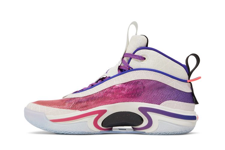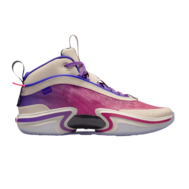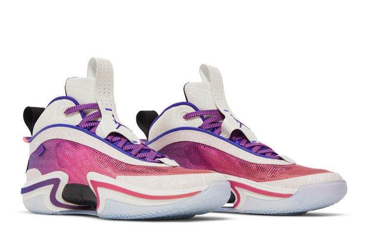 The Jordan 36 Paris features a leno-weave upper in gradient pink-to-purple shades, representing sunrise to sunset. It includes black and cream pull tabs, purple and hot pink Jumpman branding, and...