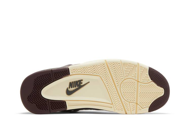 The A Ma Maniére x Air Jordan 4 Retro ‘Violet Ore’ features a purple nubuck upper with tonal netting and a chrome rivet on the collar. It includes mismatched Jumpman and A Ma Maniére branding on the tongue tags, molded black heel tabs with a Nike Air logo, and a unique message inscribed on the interior side. The sneaker offers a comfortable fit with quilted textile lining the collar and insole, and a cream-colored polyurethane midsole with visible Air-sole cushioning in the heel. This collaboration between A Ma Maniére and Jordan Brand brings a luxury touch to the classic Air Jordan 4 silhouette.