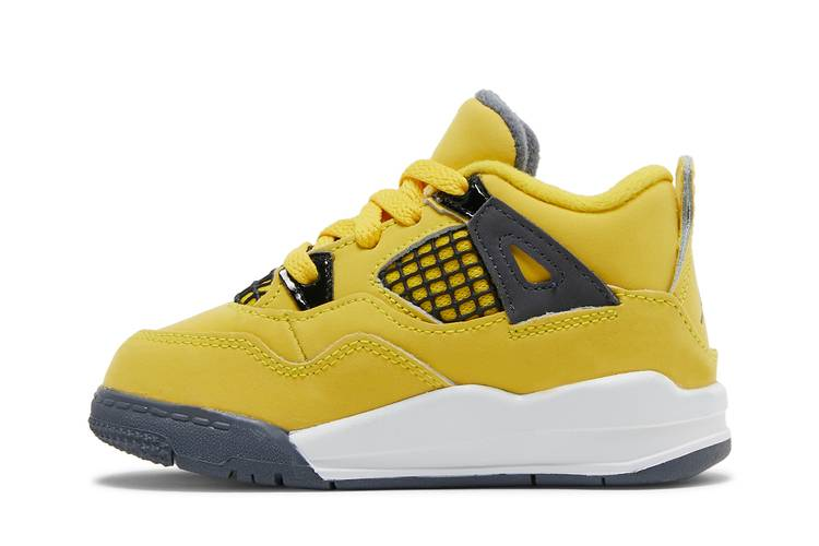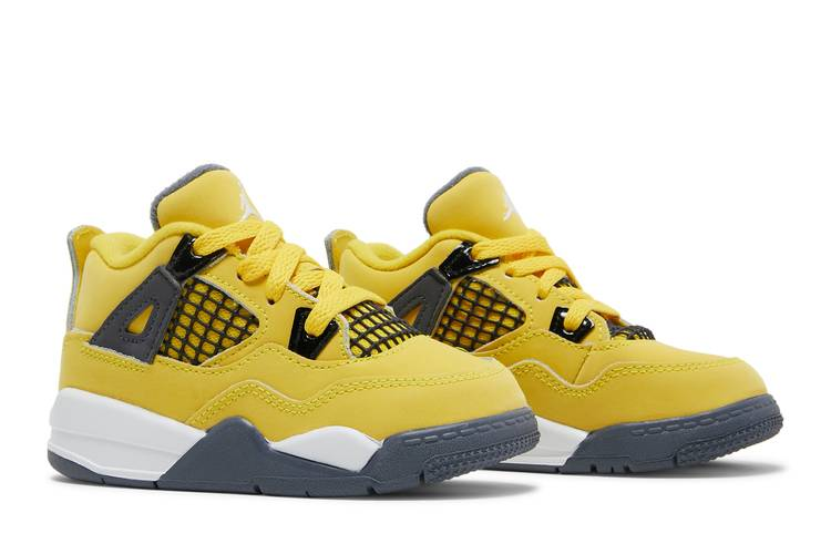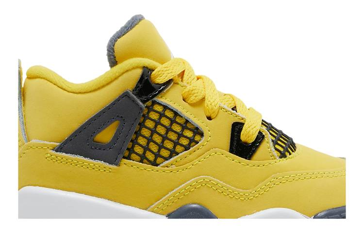 The Air Jordan 4 Retro Lightning 2021 TD features a vibrant yellow nubuck upper with black netting and dark grey accents. This toddler shoe showcases the iconic Jumpman logo on the tongue and heel, with a white foam midsole providing lightweight cushioning. The rubber outsole offers durability and traction for little ones on the move. Inspired by the original 2006 colorway, this shoe combines style and comfort for young sneaker enthusiasts.