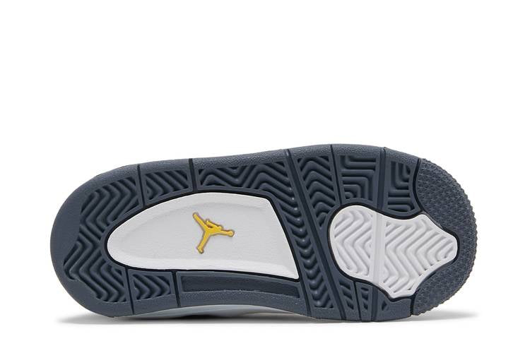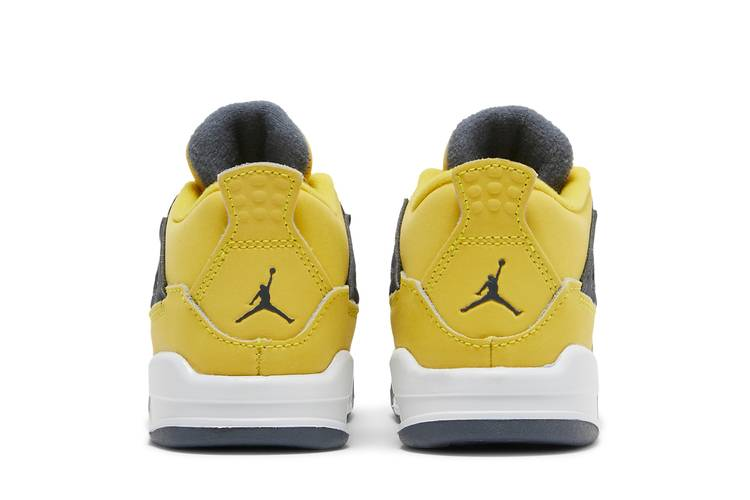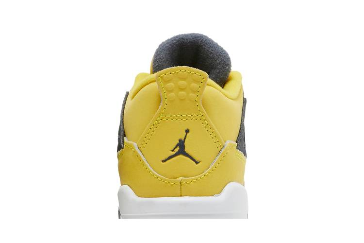The Air Jordan 4 Retro Lightning 2021 TD features a vibrant yellow nubuck upper with black netting and dark grey accents. This toddler shoe showcases the iconic Jumpman logo on...