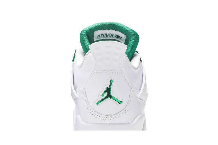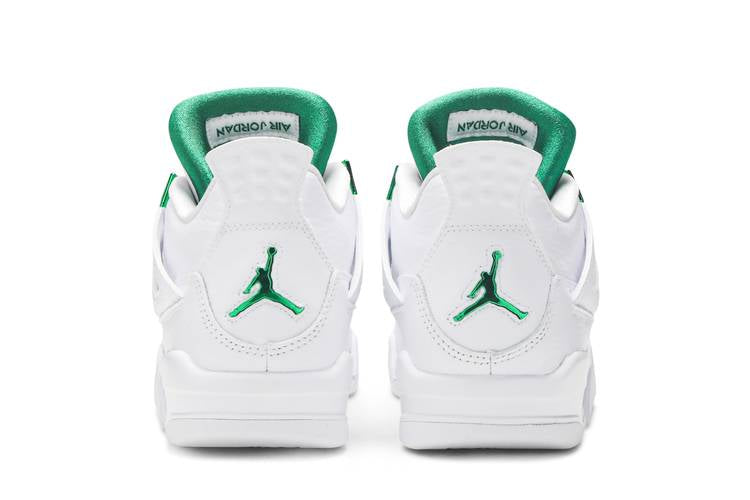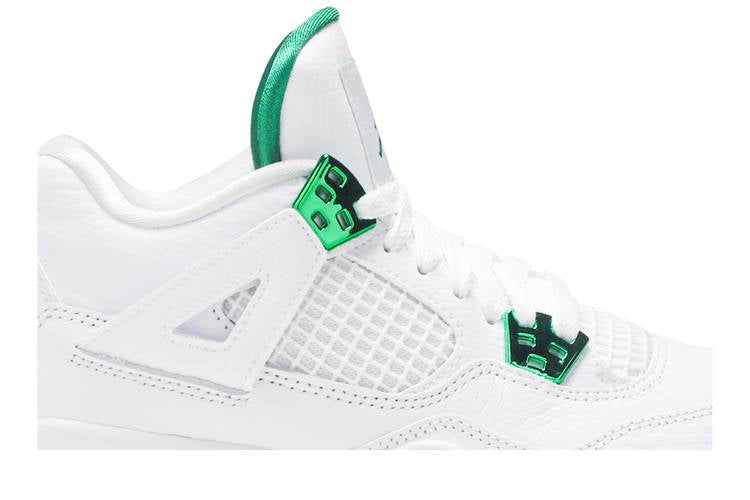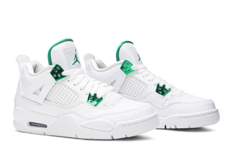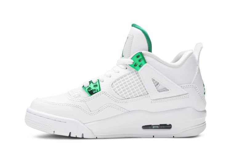 The Jordan 4 Retro Metallic Green (GS) features a white upper with Metallic Green accents on the plastic eyelets, tongue lining, and Jumpman logos. This shoe includes signature AJ4 design...