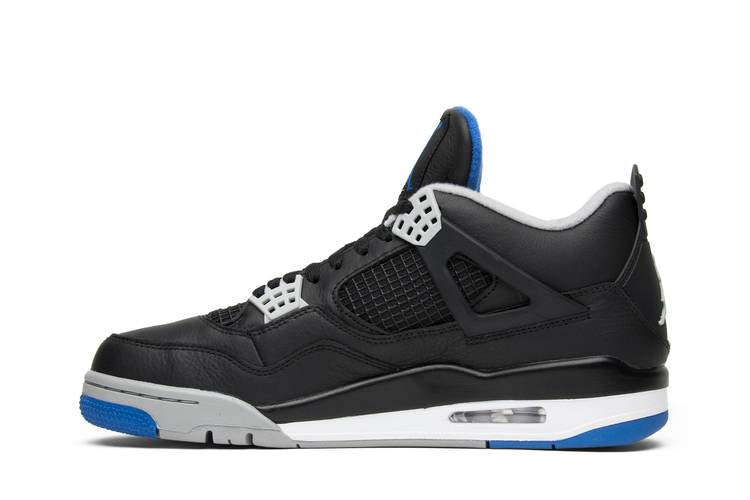 The Air Jordan 4 Retro Motorsports Alternate is a stylish and sleek sneaker inspired by Michael Jordan's motorcycle racing team. Featuring a black leather upper with Matte Silver detailing, this shoe stands out with its unique color scheme of black, game royal, matte silver, and white. The shoe also includes a polyurethane midsole with visible Air cushioning for added comfort. The design pays homage to a hyper-limited colorway gifted to the racing team in 2006. Released on June 17, 2017, this shoe is a must-have for any sneaker enthusiast.
