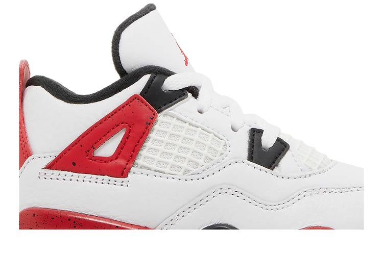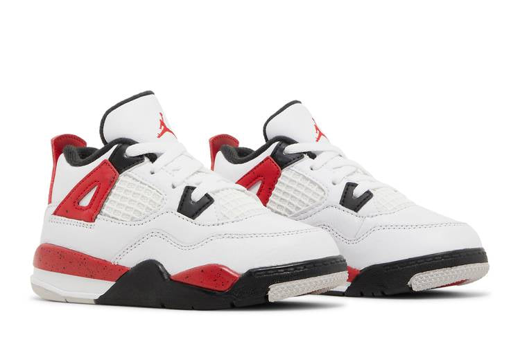 The Jordan 4 Retro Red Cement (TD) is a toddler-sized sneaker featuring a white leather upper with Red Cement accents on the wings, tongue, and heel tab. Black details and Jumpman logos add contrast, while a foam midsole provides lightweight cushioning. The design is inspired by the original 'White Cement' colorway, giving little feet a stylish and comfortable option.