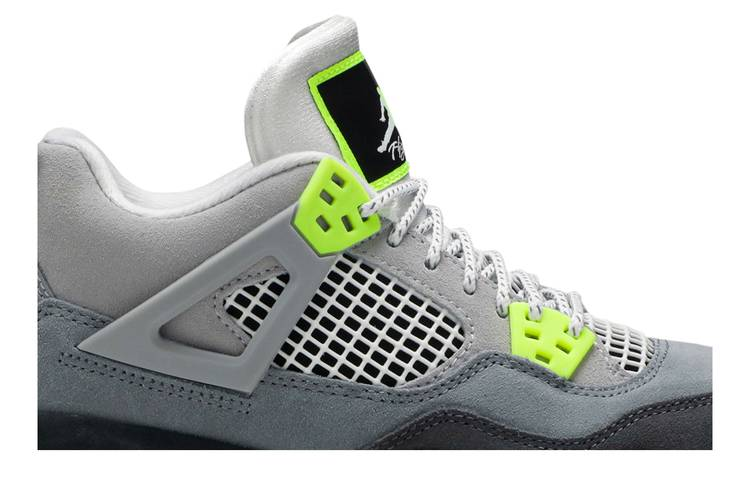 The Air Jordan 4 Retro SE Neon (GS) features a suede upper in mixed grey with neon yellow accents. This grade-school model includes quarter panel netting, eyelets, and a Nike...