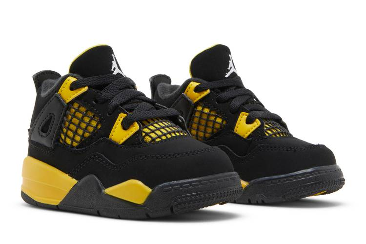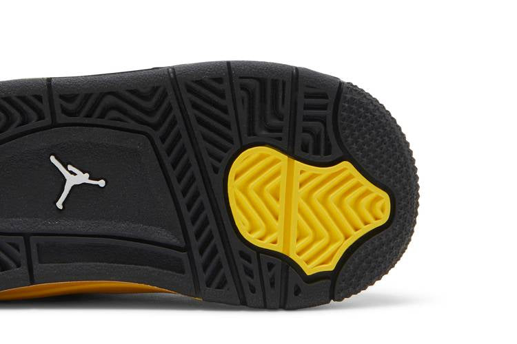 The Jordan 4 Retro Thunder 2023 (TD) features a black nubuck upper with Tour Yellow accents on the eyelets, lower tongue, and quarter panel. The classic Jumpman branding is displayed...