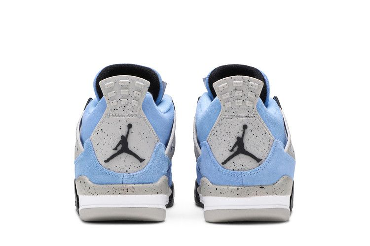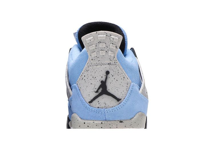 The Air Jordan 4 Retro University Blue GS features a suede upper in a University of North Carolina-inspired color. The design includes a woven jock tag on the tongue reminiscent of vintage Nike basketball jerseys. Speckled grey detailing can be found on the wings, midsole, and heel tab adorned with Jumpman branding. The sneaker also boasts classic cement detailing on the back and a visible air unit at the heels.