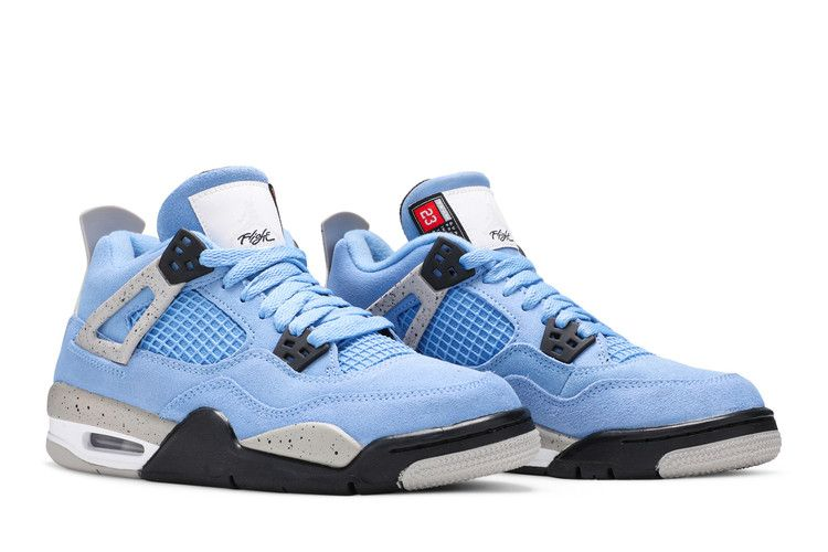 The Air Jordan 4 Retro University Blue GS features a suede upper in a University of North Carolina-inspired color. The design includes a woven jock tag on the tongue reminiscent...