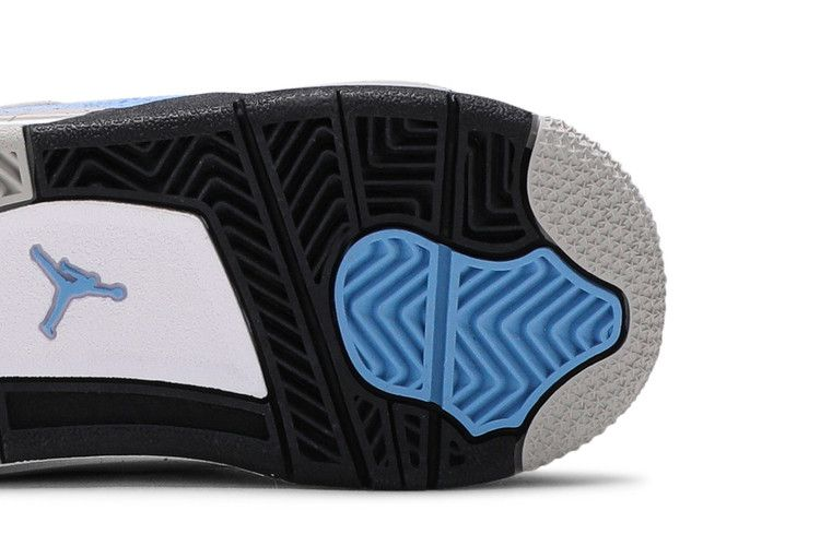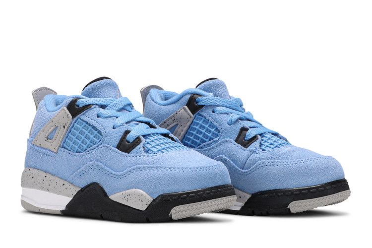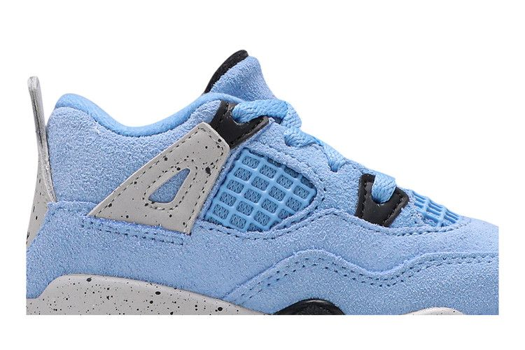 The Air Jordan 4 Retro University Blue TD is a toddler-sized sneaker featuring a suede upper in Tar Heel blue with speckled grey detailing. Inspired by the University of North Carolina, this shoe includes a foam midsole for cushioning and a herringbone pattern rubber outsole for reliable traction. Released on April 28th, 2021, this miniaturized version of the classic silhouette is a stylish addition to any young sneakerhead's collection.