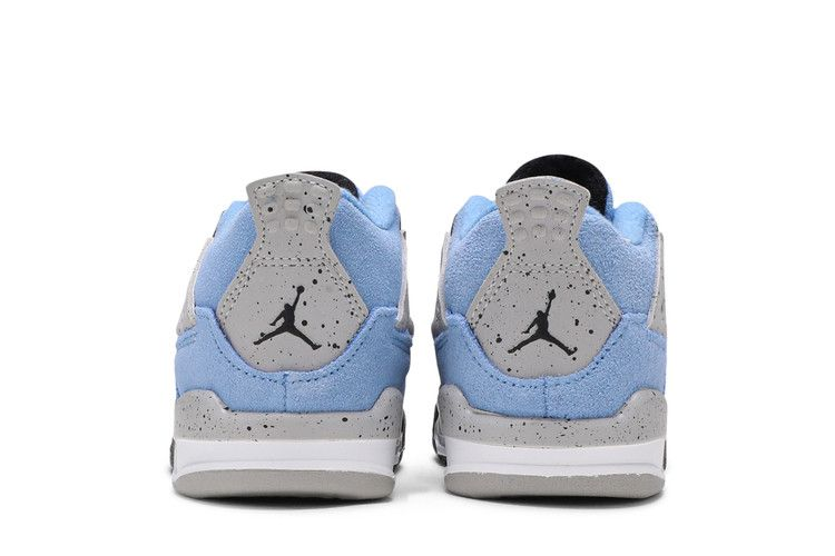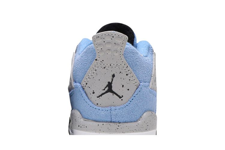 The Air Jordan 4 Retro University Blue TD is a toddler-sized sneaker featuring a suede upper in Tar Heel blue with speckled grey detailing. Inspired by the University of North...