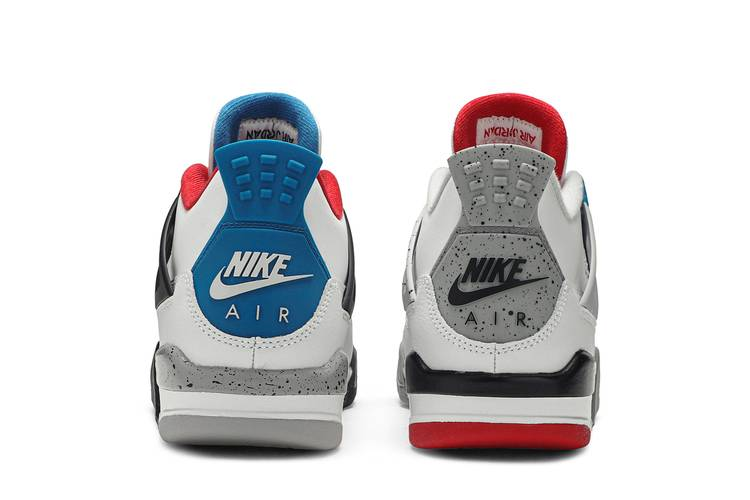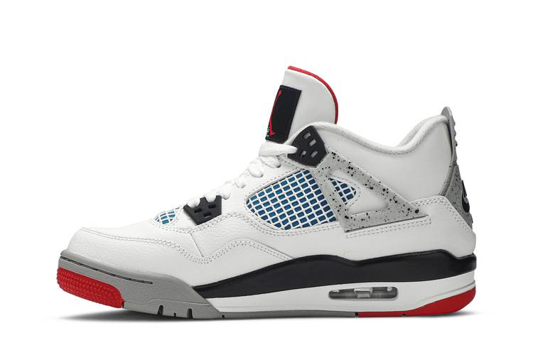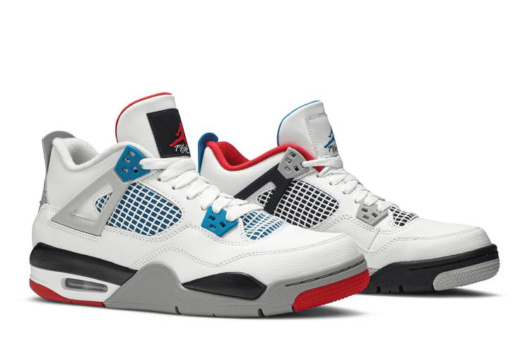 The Air Jordan 4 Retro What The (GS) is a design collaboration by Tinker Hatfield, featuring a white leather upper with window mesh panels for ventilation. It includes blue and...