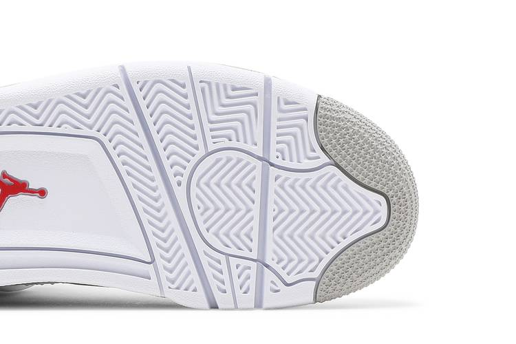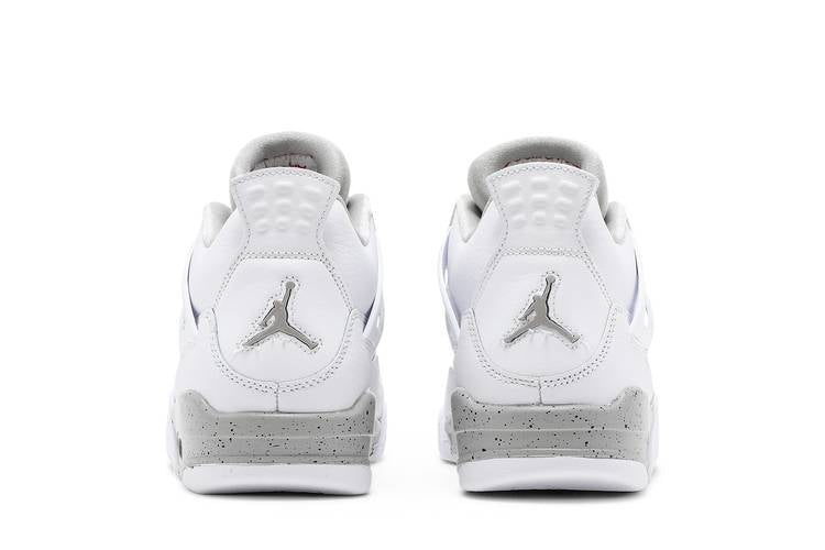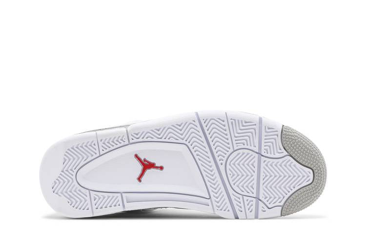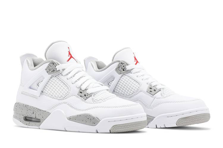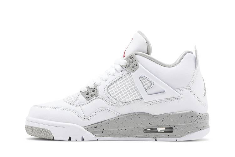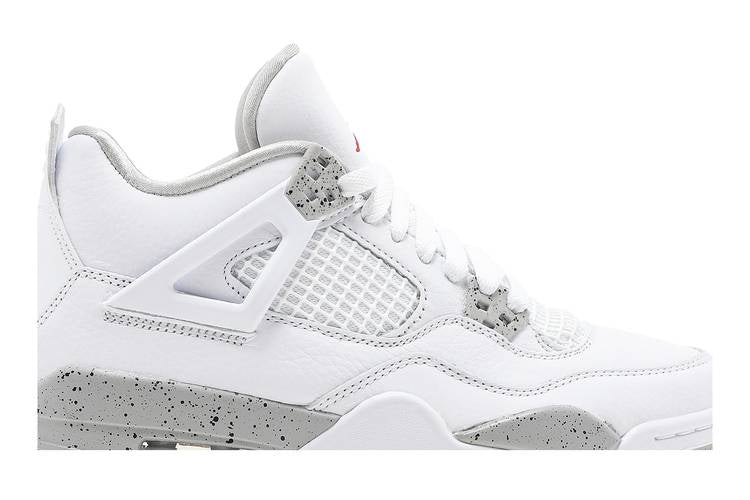 The Air Jordan 4 Retro White Oreo (2021) (GS) is a stylish and iconic sneaker designed for big kids. Crafted with a white tumbled leather upper and grey Jumpman branding, this shoe pays homage to MJ's famous playoff shot in 1989. The molded eyelets and foam midsole feature black speckled detailing, while a Fire Red embroidered Jumpman icon adds a pop of color to the white leather tongue. The webbed canvas upper and leather components create a durable and fashionable design, making this sneaker a must-have for any young Jordan fan.