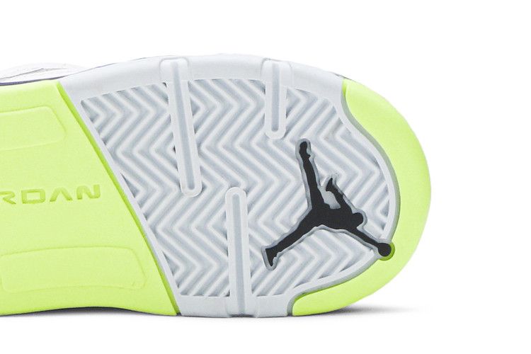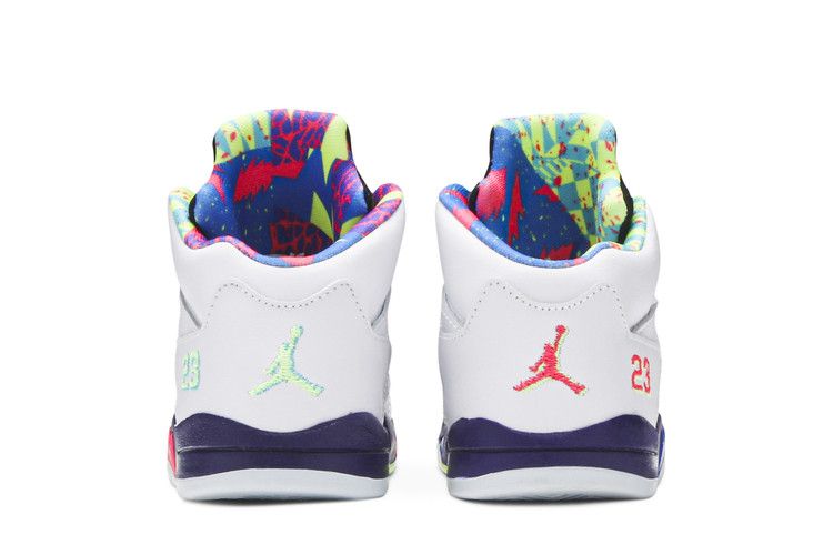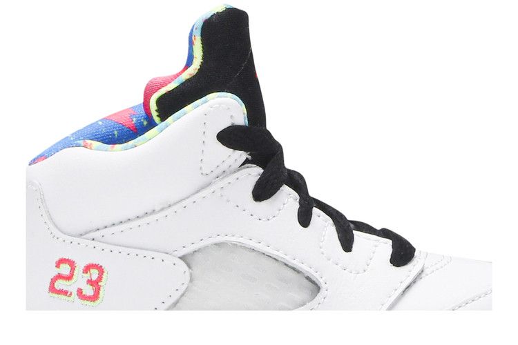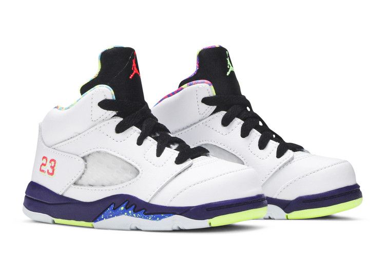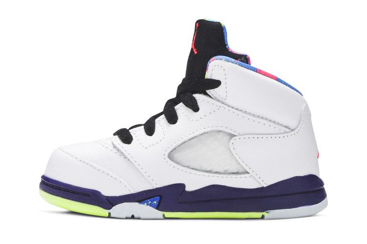 The Jordan 5 Retro Alternate Bel-Air (TD) features a white, court purple, racer pink, and ghost green colorway. The upper combines premium leather and synthetic materials for durability, with Jumpman...