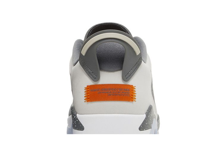 The Air Jordan 6 Retro Low PSG (2023) features a Light Bone and Iron Grey upper with white accents. Magma orange highlights the Jumpman logo on the tongue and heel...