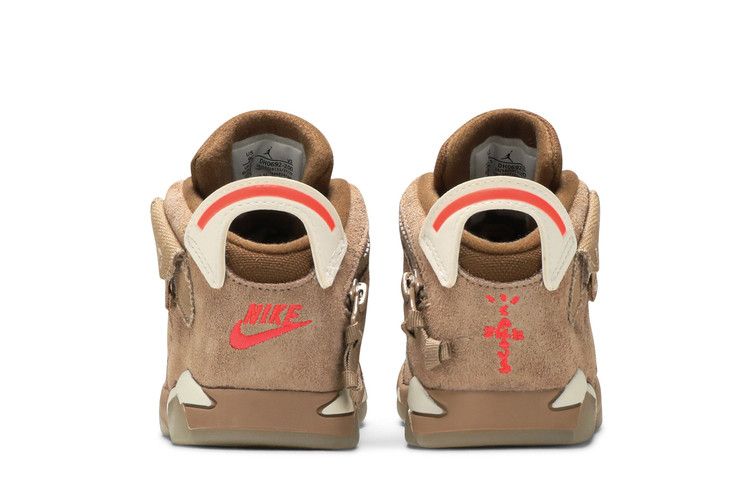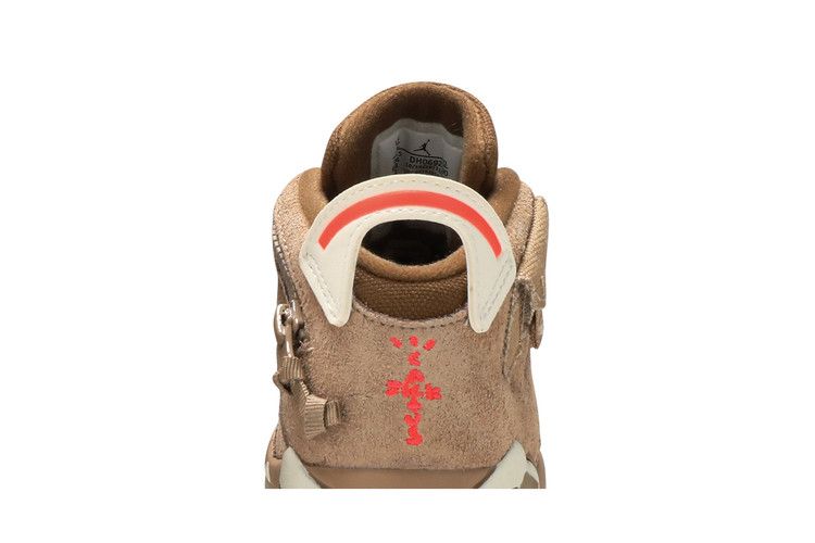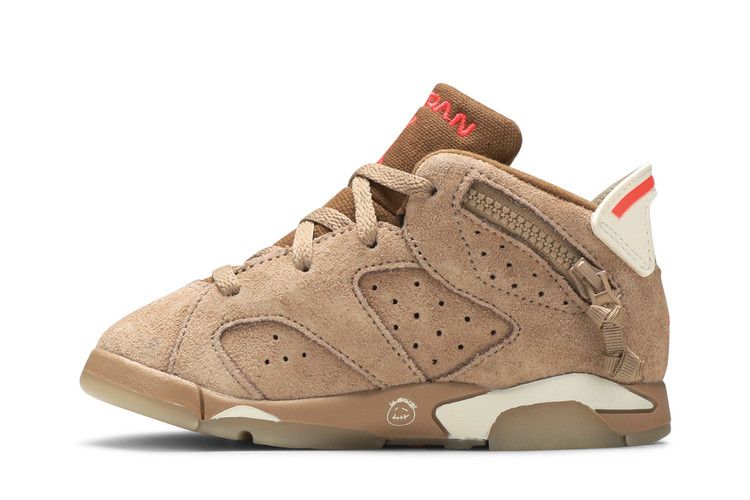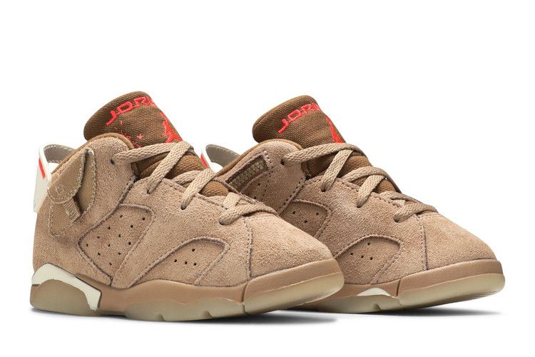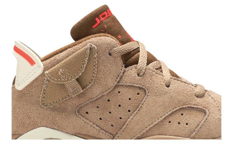 The Air Jordan 6 Retro Travis Scott British Khaki TD features a suede and canvas upper with a rubber sole. It comes in British Khaki, Bright Crimson, and Sail colorways....
