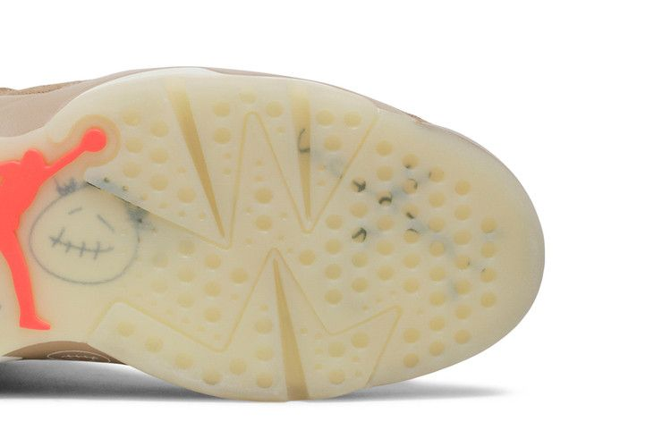 The Air Jordan 6 Retro Travis Scott British Khaki features a suede and canvas upper with Bright Crimson accents. It includes a stash pouch on the lateral collar and zippered...