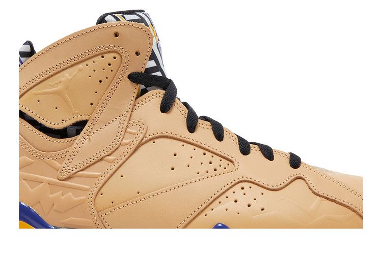 The Air Jordan 7 Retro SE Vachetta Tan features a tan upper with black accents on the laces, midsole, and branding. Purple and orange block details highlight the midsole and outsole. The design includes a neoprene tongue with pull tabs, visible Air cushioning, and Jumpman branding on the heel. Geometric patterns and Afrobeats-inspired graphics adorn the ankle and heel. Released on October 22, 2022, the Air Jordan 7 Retro SE Vachetta Tan is available now at Side Kicks.