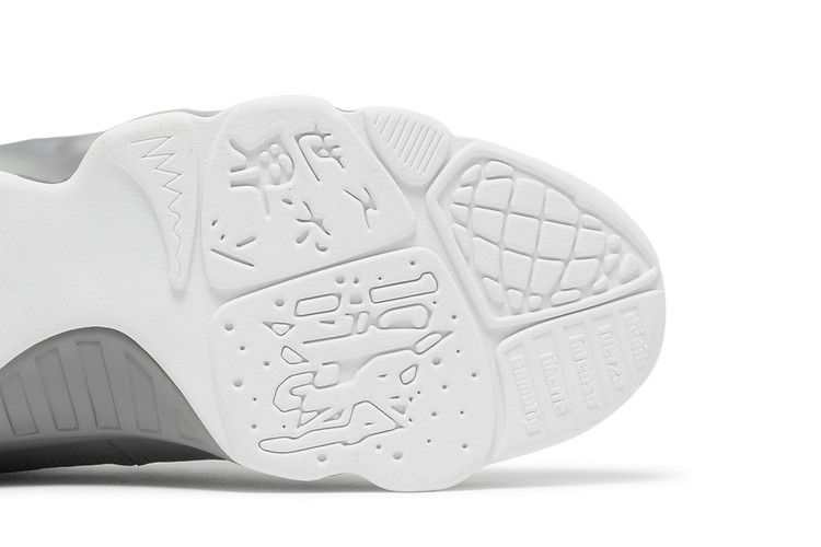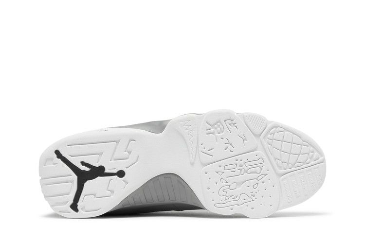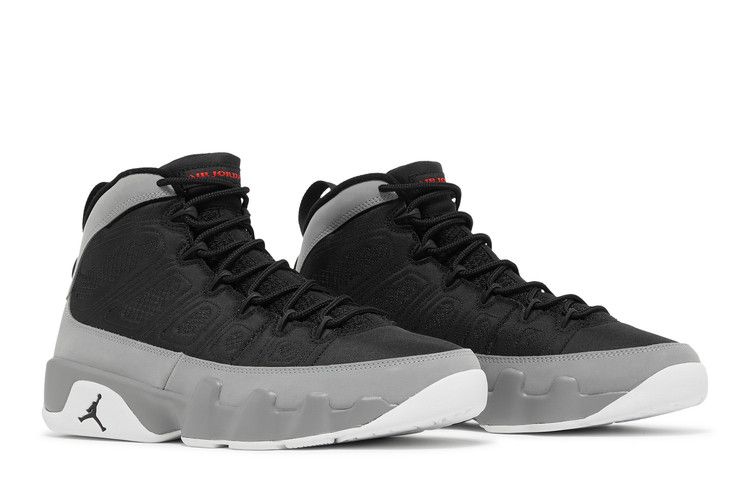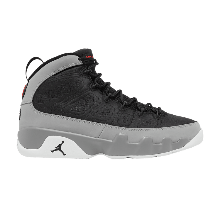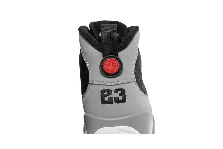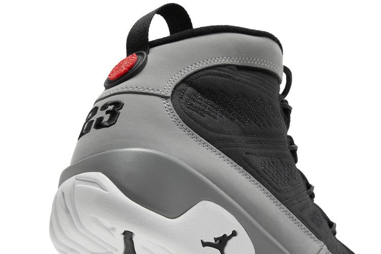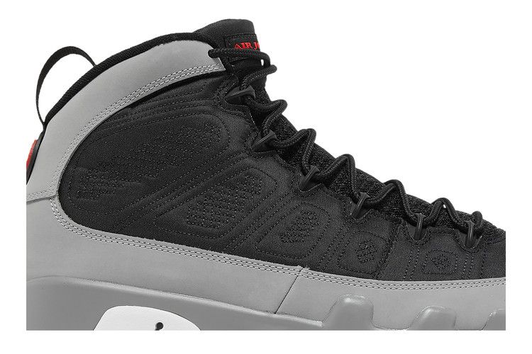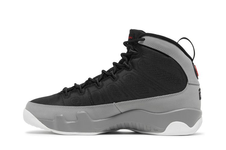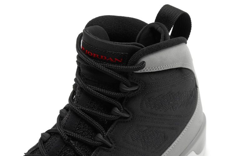 The Jordan 9 Retro Particle Grey features a black nylon upper with quilted Particle Grey panels on the ankle, heels, and midsole. A light grey Durabuck mudguard adds durability, while...