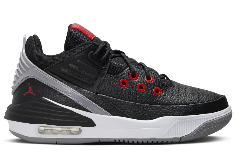 The Jordan Max Aura 5 Black White Cement Grey University Red (GS) is now available at Side Kicks!
