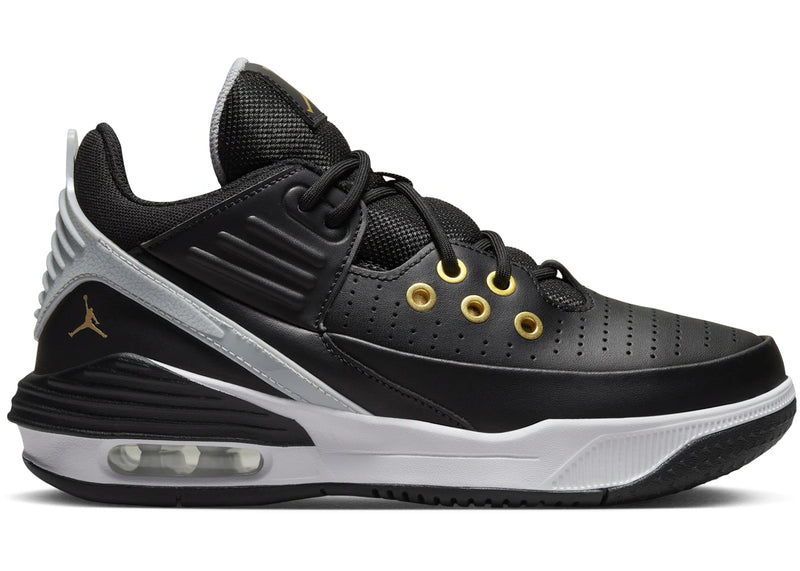 The Jordan Max Aura 5 Black White Wolf Grey Metallic Gold (GS) is now available at Side Kicks!