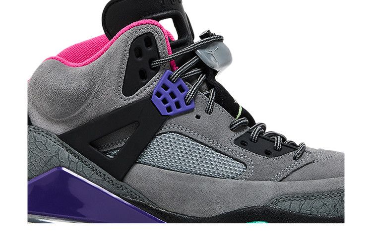 The Jordan Spizike 270 Boot Smoke Gray reinterprets Spike Lee’s Spizike with winter-ready updates. It features a suede upper with mesh side panels, nodding to its basketball roots. Smoke Gray dominates the base, accented by Barely Volt, purple, and fuchsia details. The padded collar includes fuchsia knit lining, while purple plastic highlights the midsole and lace cage. A neon yellow 'Brooklyn' graphic appears on the heel, and elephant print leather covers the mudguard and heel overlay. The design incorporates a visible Air Max 270 unit for cushioning.