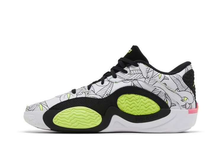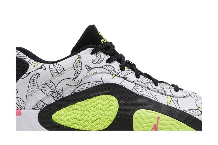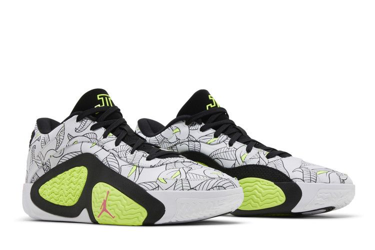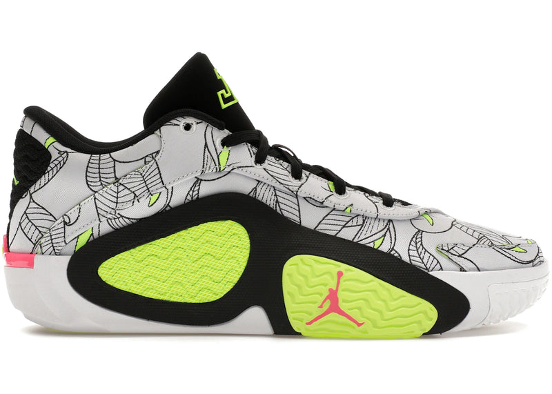The Jordan Tatum 2 Momma's Boy features a white upper with calla lily outlines and bright yellow accents, inspired by Jayson Tatum’s mother. A black tongue includes a yellow JT...