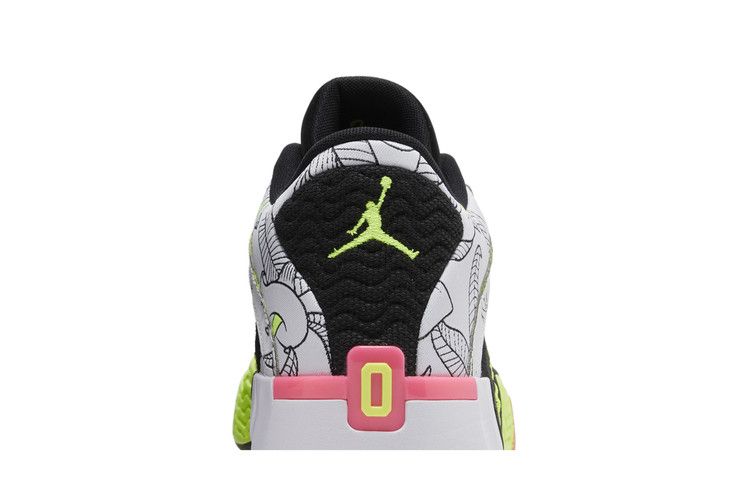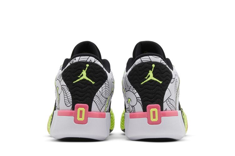 The Jordan Tatum 2 Momma's Boy features a white upper with calla lily outlines and bright yellow accents, inspired by Jayson Tatum’s mother. A black tongue includes a yellow JT logo, while the heel collar displays a Jumpman logo and the number 0 on a pink background. The midsole has yellow supports with black outlines, and a pink Jumpman appears on the lateral side. A full-length Air Strobel unit enhances performance.