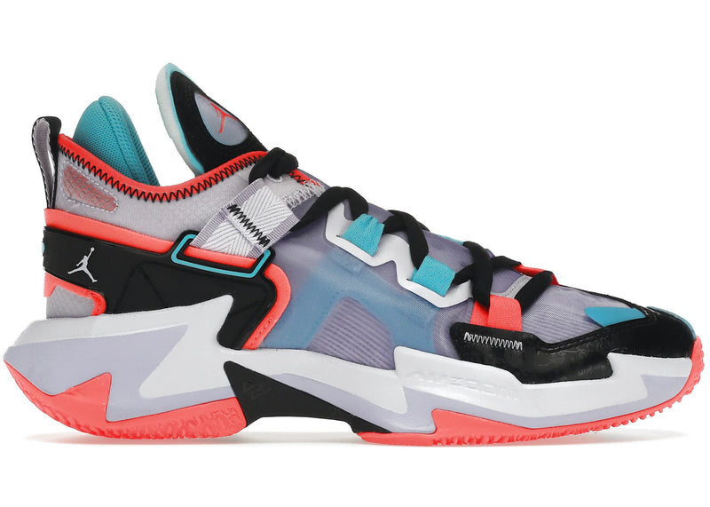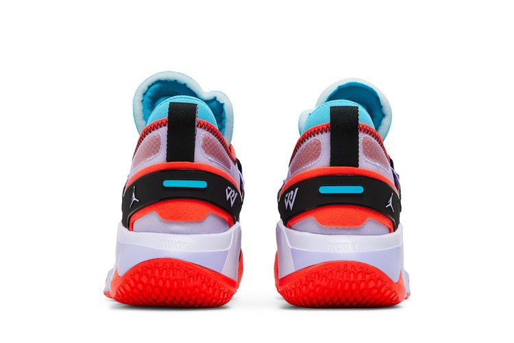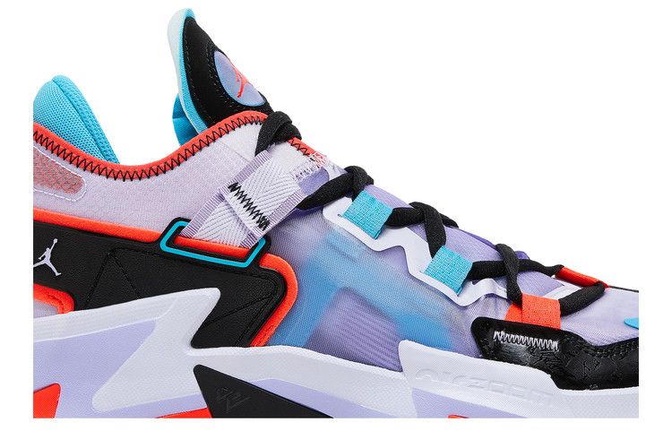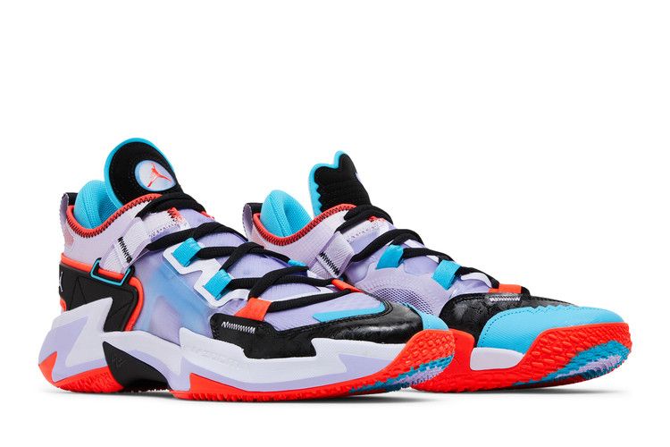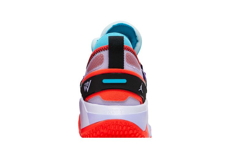 The Jordan Why Not Zer0.5 Childhood features a textile upper in lavender with black synthetic overlays and a black heel counter accented in Bright Crimson. Aqua webbing eyelets and a...