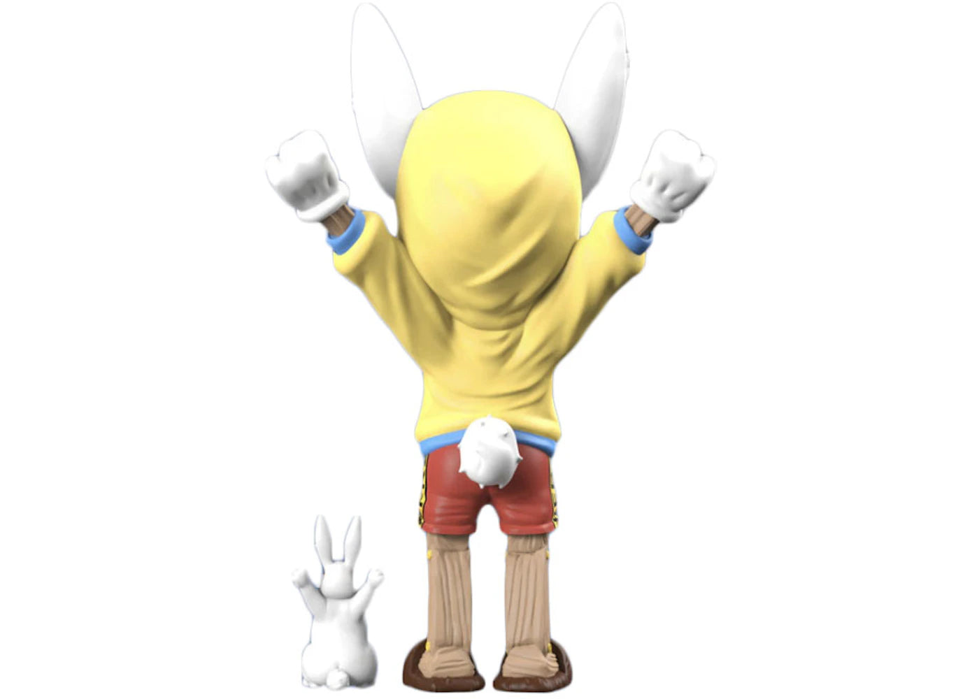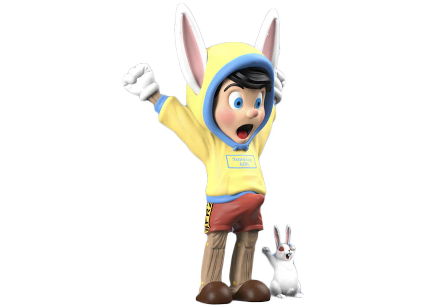 This "A Wood Awakening" figure features a reimagined version of Pinocchio, with bunny ears, dressed in a yellow and blue #FR2 "Smoking Kills" hoodie, standing next to a tiny #FR2 rabbit figure. The figure is also dressed in red shorts, white gloves, and red slides. Both figures display the same provocative pose. They are made of high-quality vinyl.