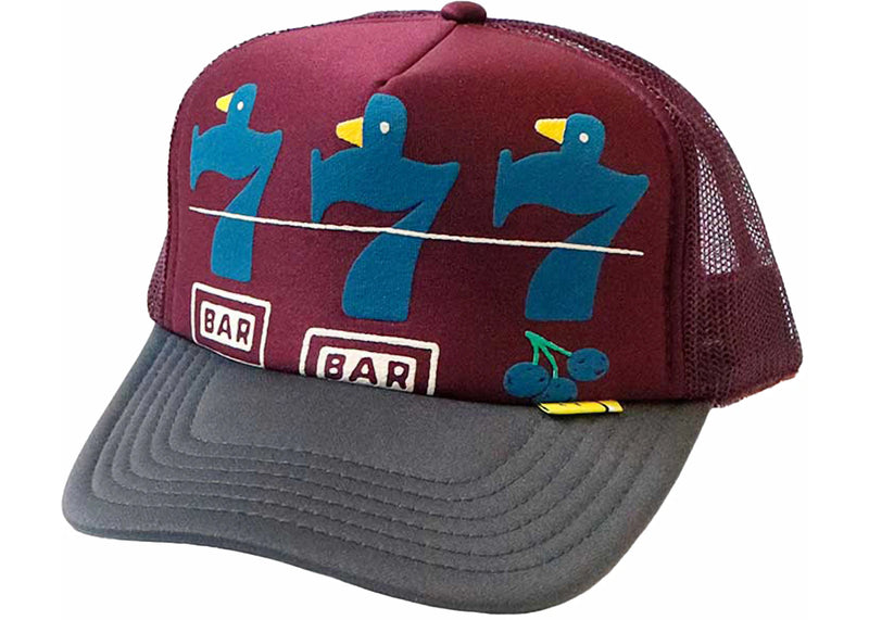 The Kapital Lucky Battery Bird Trucker Cap Red/Charcoal is now available at Side Kicks!